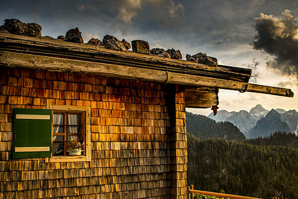 Bildagentur Mauritius Images Deutschland Bayern Berchtesgaden Berchtesgadener Alpen Berge Alpen Almhutte Landschaft Sommer Gebirge Watzmann Wolken